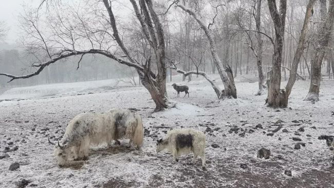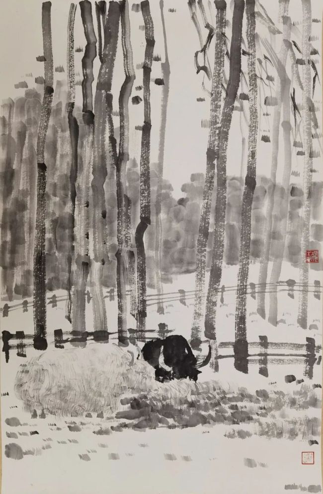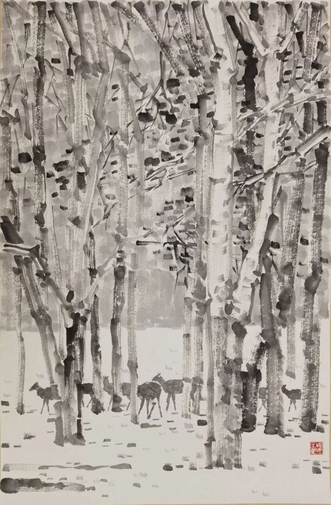 这些北国别致的风景触发了我的创作灵感,我即兴在园区的会议室创作了两幅水墨画作品《呦呦鹿鸣》和《雪中饮草的牦牛》。